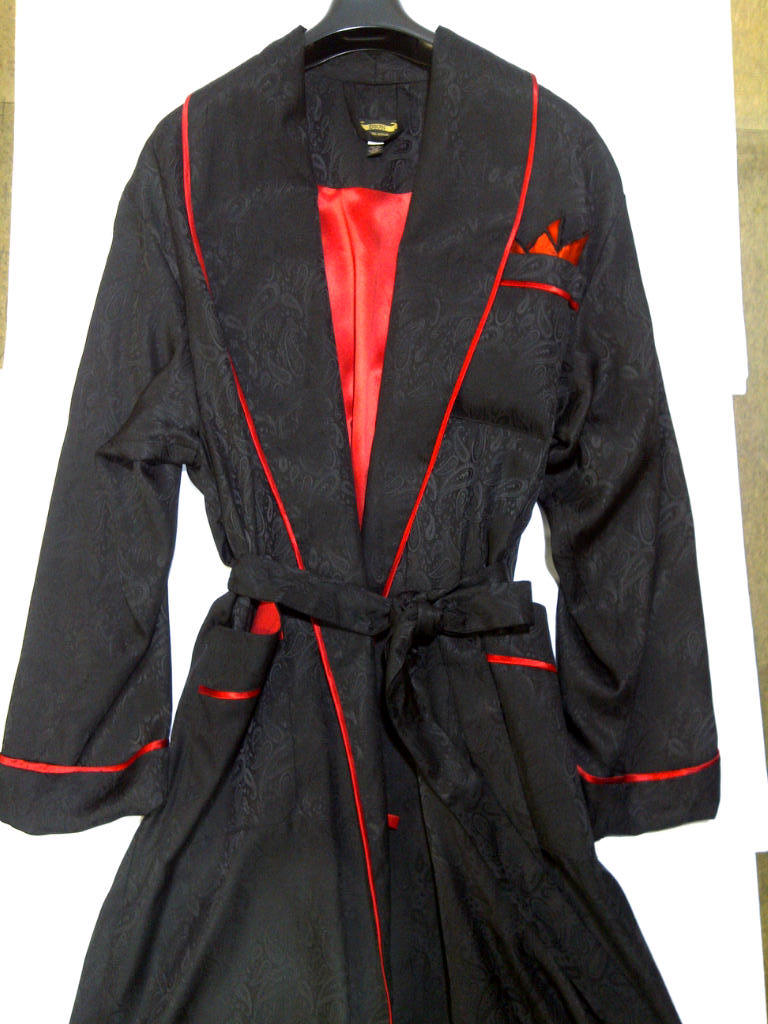 Black Paisley Tone-on-Tone Silk Wrap Robe 100% Silk Wrap Style Shawl Collar is Self Fabric Three open patch pockets Cording Trim--Red