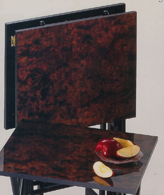 (Left to Right....Mahogany, Burl.....plus new Glossy Black !) Brass Hardware, Strong Leg Construction, Gloss Finish Laminate, Cross Bars for Stability, Bull Nosed Edge Tops, Folding These are made up just for you and are a Custom order...allow 10 days+ before shipping. 16" X 19" x 25" New All White just added by popular demand !