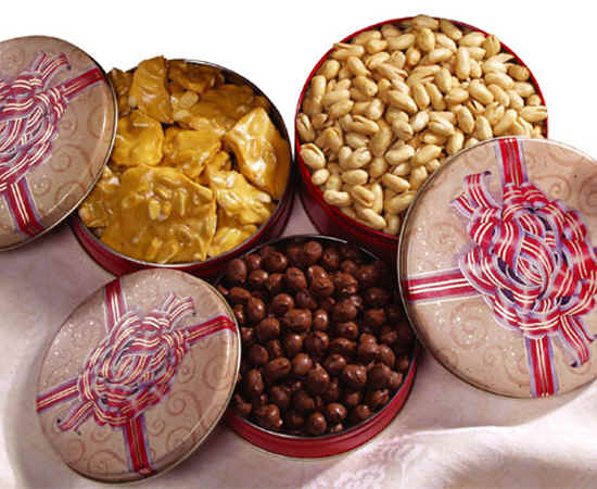 uniquely styled seasoned Virginia jumbo peanuts in colorful tins.